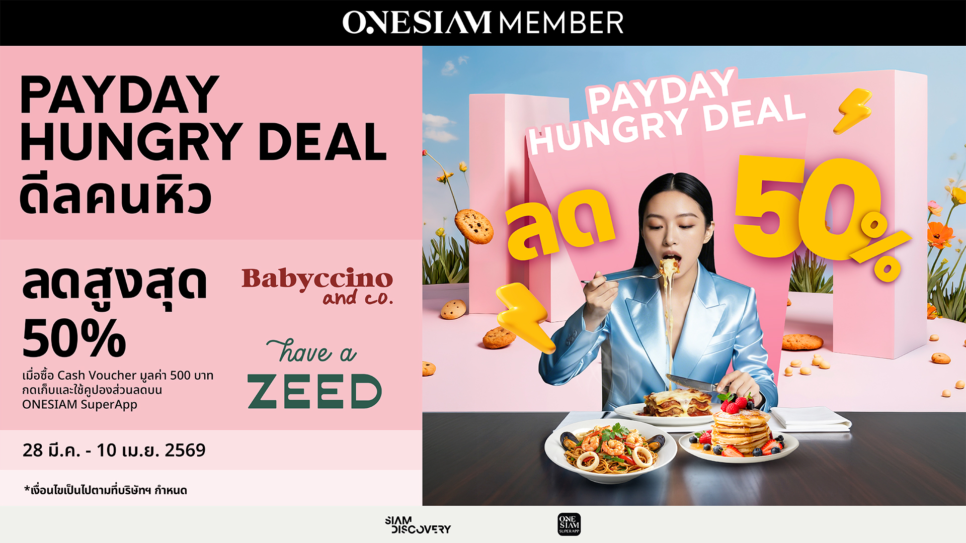 คนหิวตำด่วน!! PAY DAY HUNGRY DEAL ลดสูงสุด 50% เมื่อซื้อ Cash Voucher 500 บาท บน FOOD DEAL บน ONESIAM SuperApp เฉพาะร้าน Have a ZEED หรือ Babyccino