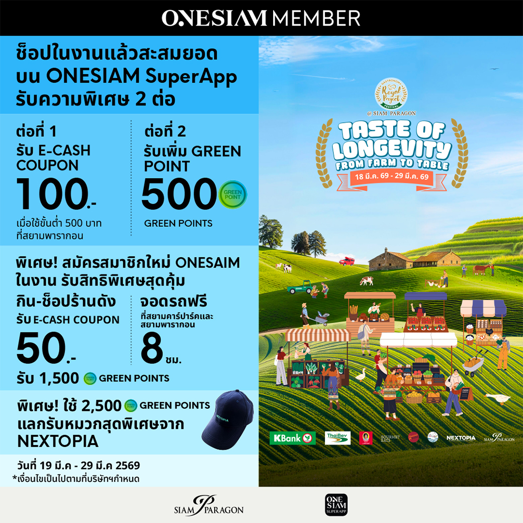 เฉพาะสมาชิก ONESIAM เมื่อช็อปที่งาน Royal Project Festival 2026 ณ NEXTOPIA ระหว่างวันที่ 19 มีนาคม – 29 มีนาคม 2569 พร้อมลงทะเบียนและสะสมยอดใช้จ่ายขั้นต่ำแค่ 100.- รับเพิ่ม e-Cash Coupon มูลค่า 100.- สำหรับใช้ขั้นต่ำ 500 บาท ในสยามพารากอนครั้งถัดไป