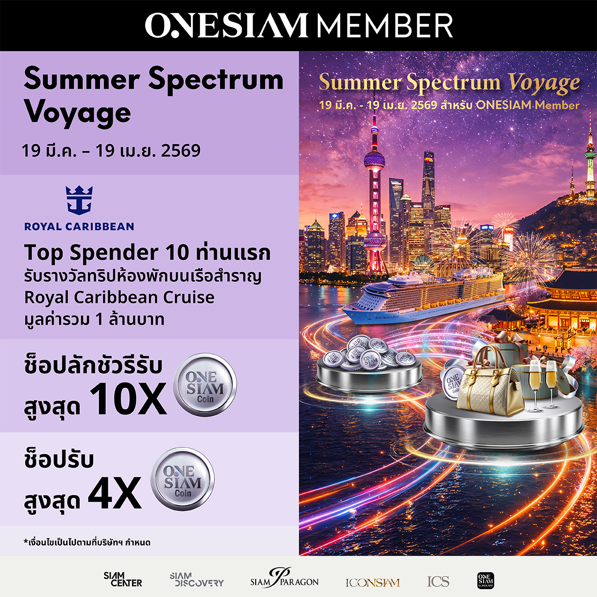 สิทธิพิเศษสำหรับสมาชิก ONESIAM ที่ลงทะเบียนเข้าร่วมโปรโมชันผ่าน บน ONESIAM SuperApp ภายในวัน ณ ร้านที่ร่วมรายการ*ใน สยามพารากอน สยามเซ็นเตอร์ สยามดิสคัฟเวอรี่ ไอคอนสยาม และไอซีเอส ระหว่างวันที่ 19 มี.ค. 69 – 19 เม.ย. 69