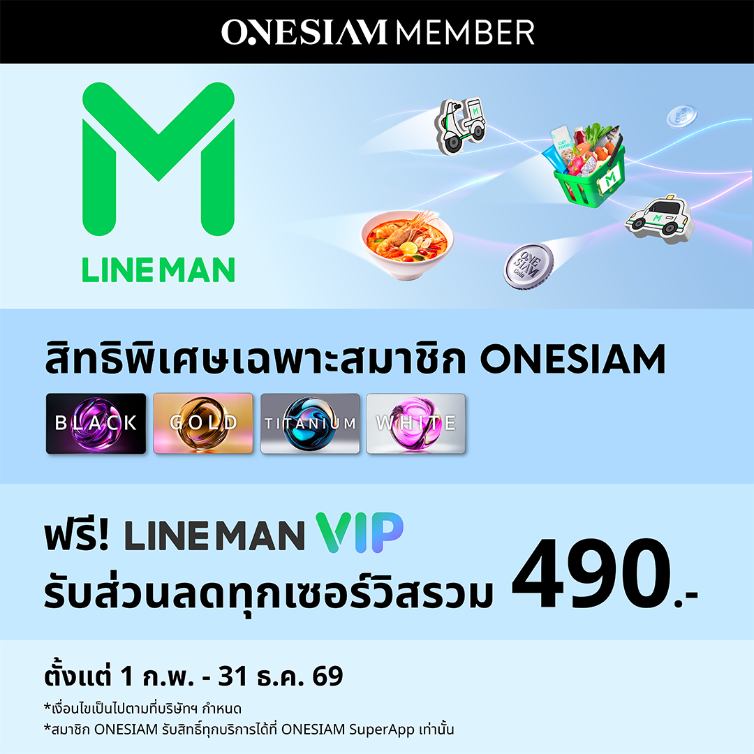สิทธิพิเศษสำหรับสมาชิก ONESIAM ที่มี ONESIAM SuperApp เมื่อใช้บริการ LINE MAN ระหว่างวันที่ 1 กุมภาพันธ์ 2569 ถึง 31 ธันวาคม 2569