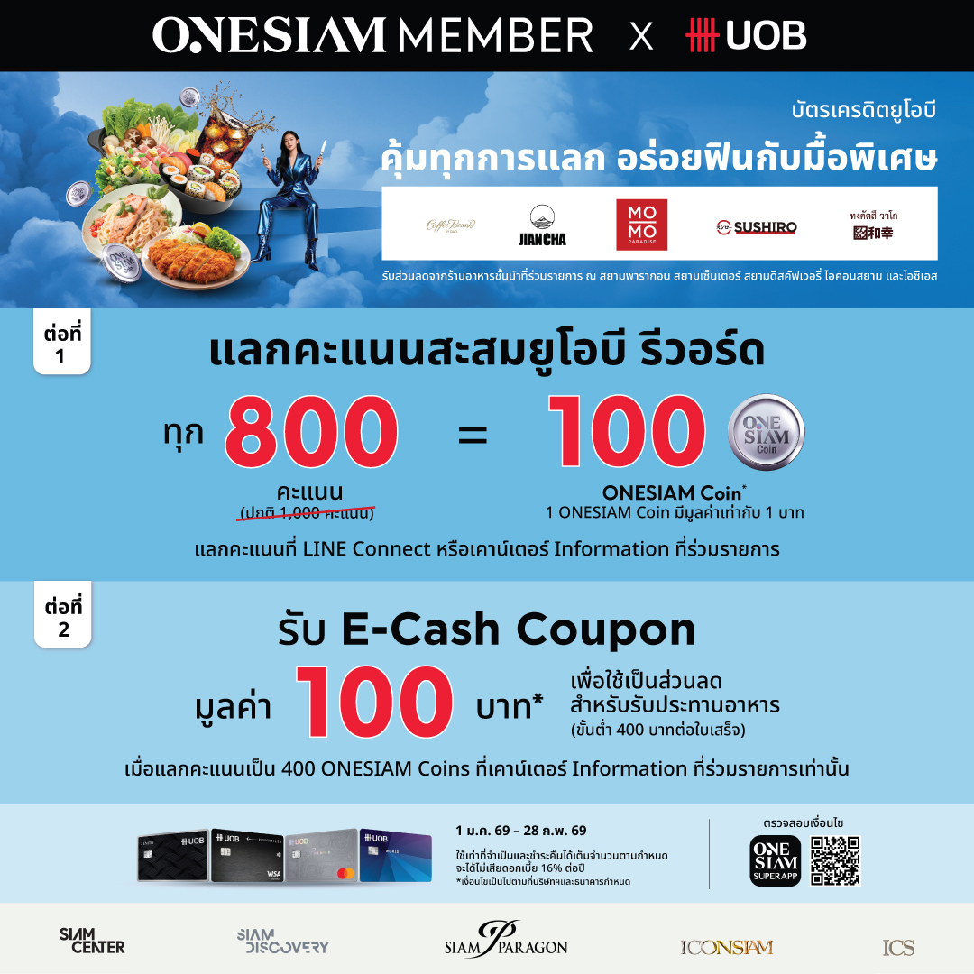 คุ้มทุกการแลก อร่อยฟินกับมื้อพิเศษ เมื่อแลกคะแนนสะสม UOB Rewards เป็น ONESIAM Coin ตั้งแต่ 1 ม.ค. 69 – 28 ก.พ. 69