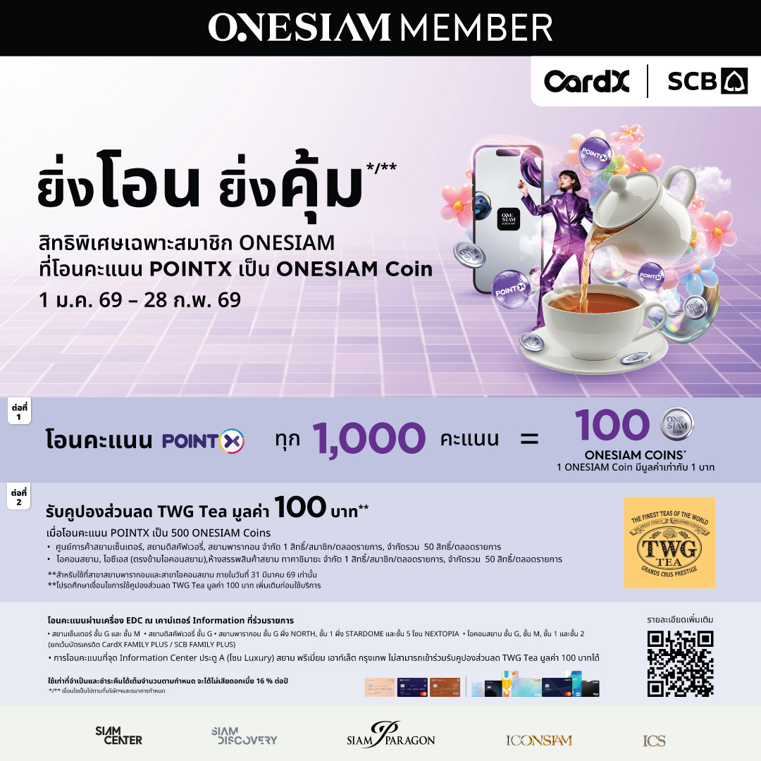 ยิ่งโอน ยิ่งคุ้ม สิทธิพิเศษเฉพาะสมาชิก ONESIAM ที่โอนคะแนน PONTX เป็น ONESIAM Coin ตั้งแต่ 1 ม.ค. 69 – 28 ก.พ. 69