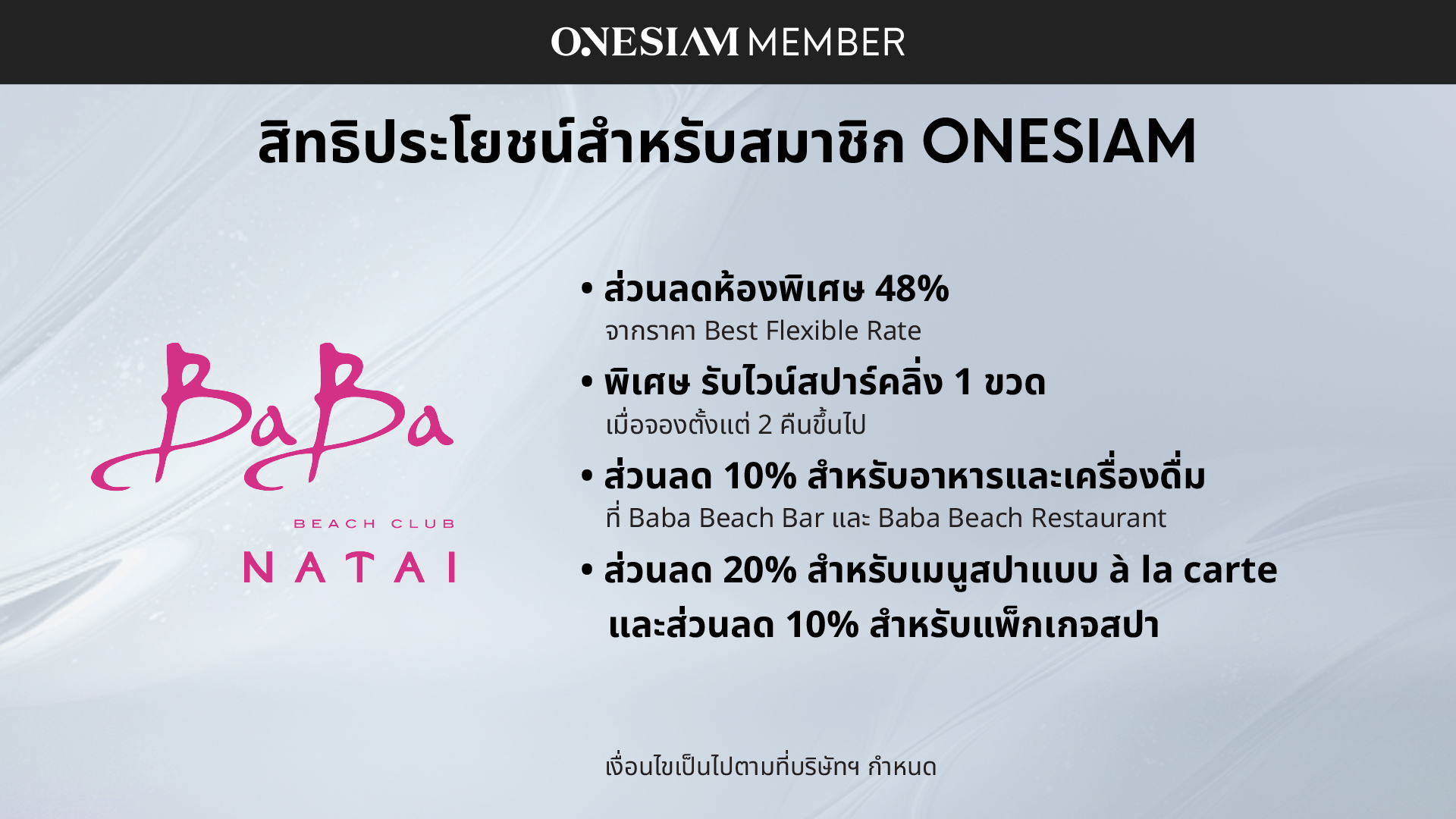 สิทธิประโยชน์สำหรับสมาชิก ONESIAM ที่ Baba Beach Club Natai