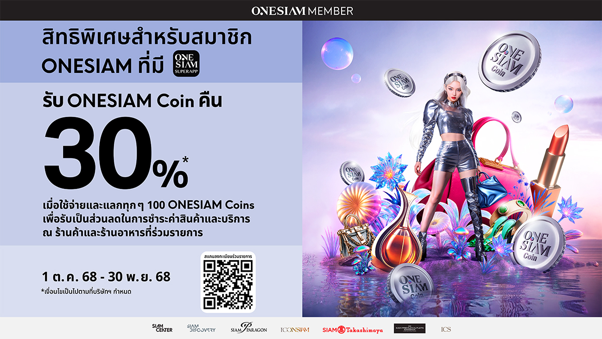 - สิทธิพิเศษสำหรับสมาชิก ONESIAM ที่มี ONESIAM SuperApp เมื่อใช้จ่าย ณ ร้านค้าและร้านอาหารที่ร่วมรายการในศูนย์การค้าสยามเซ็นเตอร์, สยามดิสคัฟเวอรี่, สยามพารากอน, ไอคอนสยาม, สยาม ทาคาชิมายะ, ไอซีเอส (ตรงข้ามไอคอนสยาม) และสยาม พรีเมี่ยม เอาท์เล็ต กรุงเทพ ระหว่างวันที่ 1 ตุลาคม 2568 - 30 พฤศจิกายน 2568