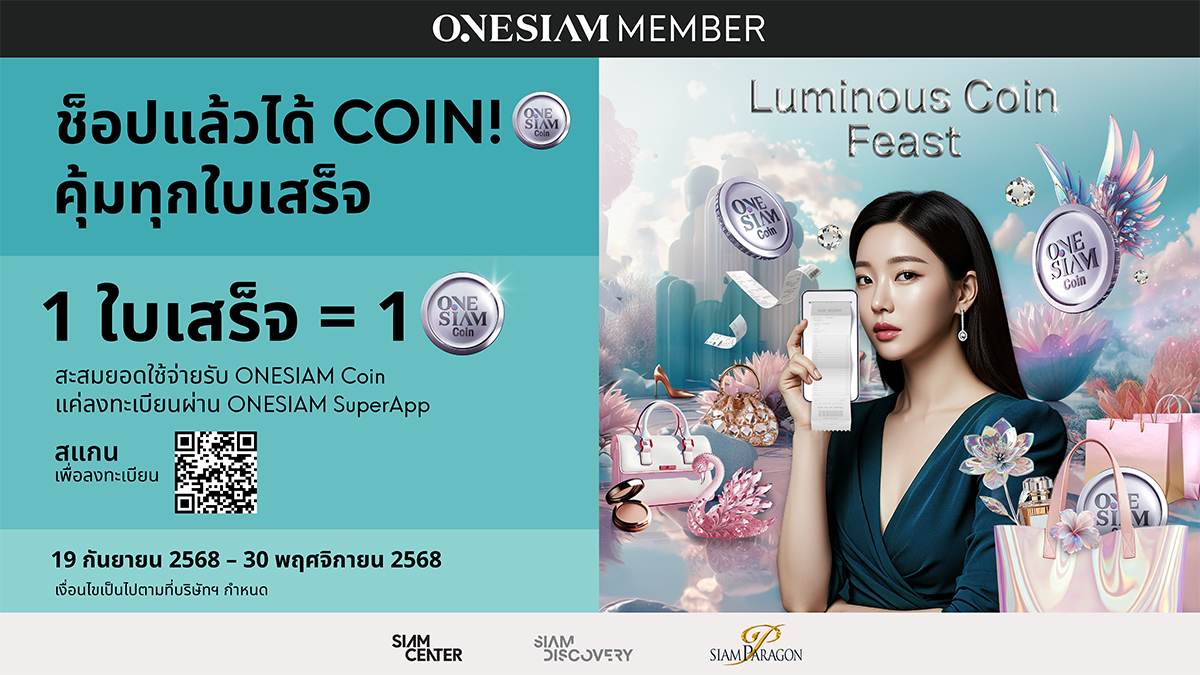 โปรโมชัน Luminous Coin Feast เฉพาะยอดใช้จ่ายที่ศูนย์การค้าสยามเซ็นเตอร์ สยามดิสคัฟเวอรี่ และสยามพารากอน (ไม่รวมยอดใช้จ่ายผ่านออนไลน์) ระหว่างวันที่ 19 กันยายน 2568 – 30 พฤศจิกายน 2568 (ลงทะเบียนก่อรรับสิทธิ์)