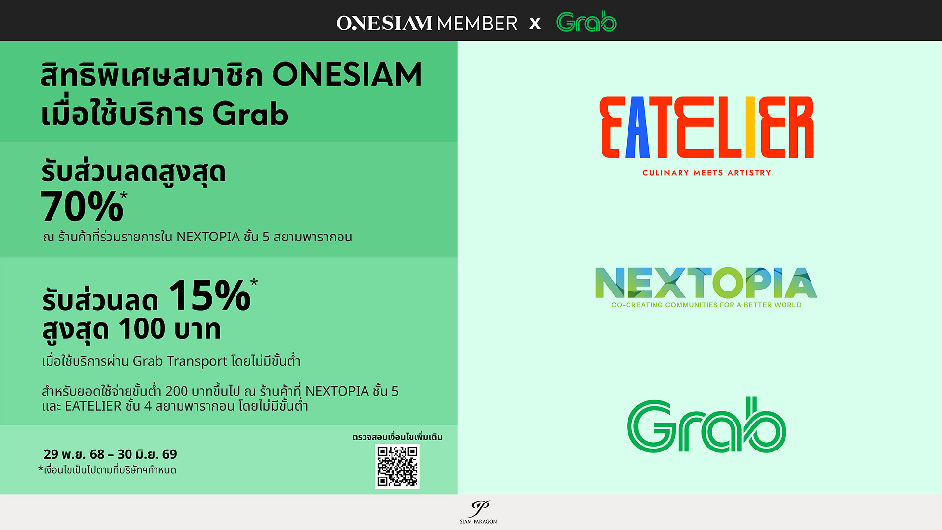 รูปแบบรายการส่งเสริมการขาย: รับส่วนลด 15% สูงสุด 100 บาท เมื่อใช้บริการผ่าน Grab Transport โดยไม่มีขั้นต่ำ (สำหรับการเดินทางออกจากสยามพารากอน หรือจุดหมายปลายทางที่สยามพารากอนเท่านั้น) เมื่อมียอดใช้จ่ายขั้นต่ำ 200 บาทขึ้นไป ณ ร้านค้าที่ NEXTOPIA ชั้น 5, 5A และ EATELIER ชั้น 4 สยามพารากอน