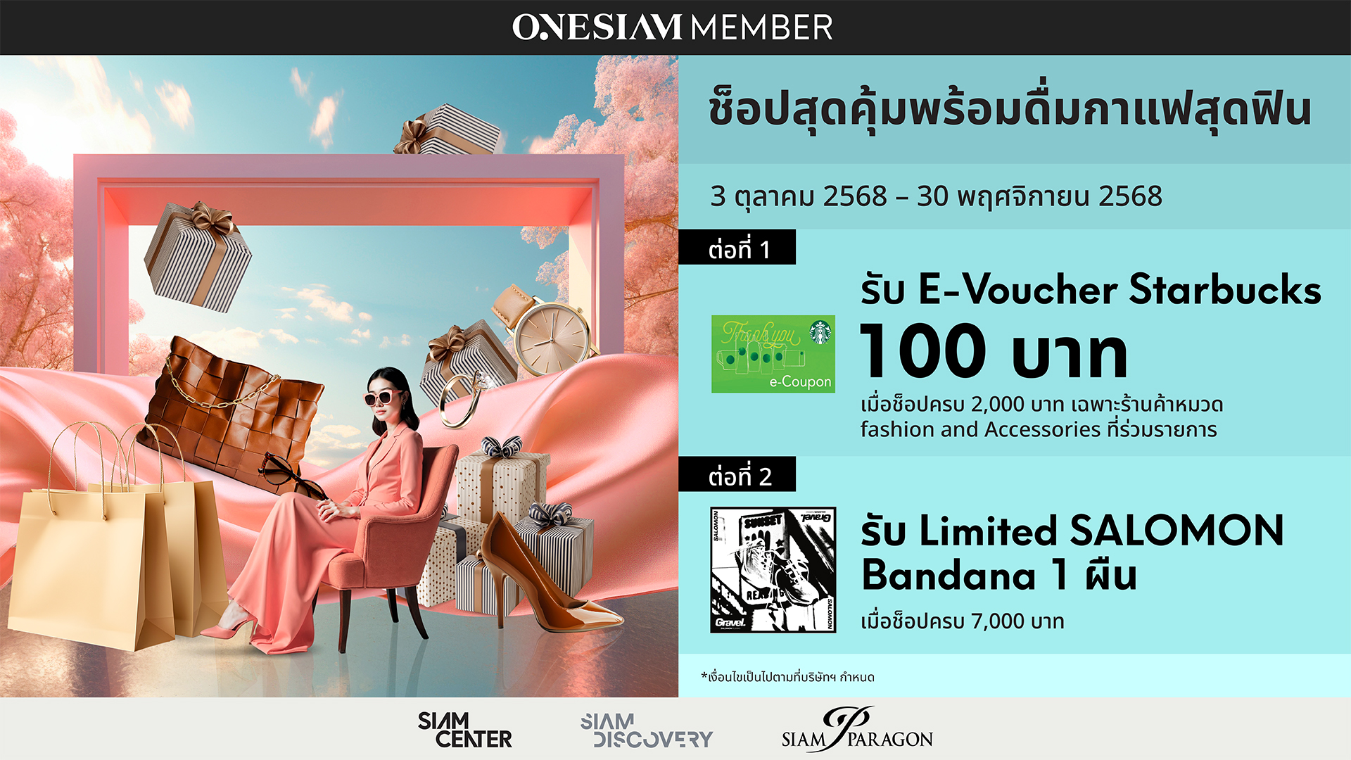- โปรโมชัน Glamour Fashion Deal เฉพาะยอดซื้อร้านค้าหมวด Fashion and Accessories ที่ สยามพารากอน สยามเซ็นเตอร์ และ สยามดิสคัฟเวอรี่ ตั้งแต่วันที่ 3 ตุลาคม 2568 – 30 พฤศจิกายน 2568 ทั้งนี้ไม่รวมยอดใช้จ่ายผ่านออนไลน์ ลงทะเบียนก่อนรับสิทธิ์ ช่องทางสะสม SNAP & COLLECT, Information Counter, สะสมที่ร้าน