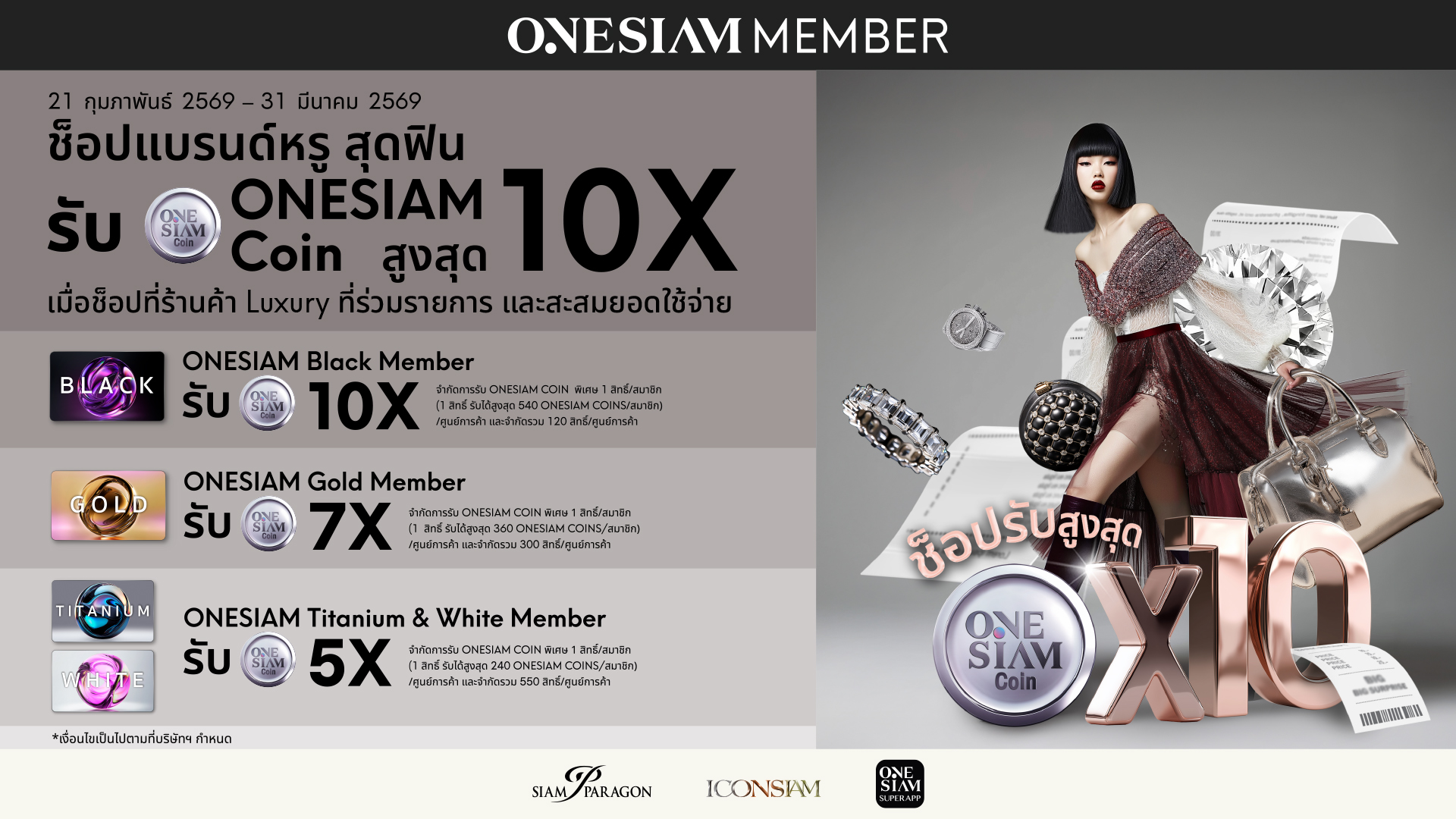 - สิทธิพิเศษสำหรับสมาชิก ONESIAM ที่มี ONESIAM SuperApp ที่ลงทะเบียนเข้าร่วมโปรโมชันและสะสมยอดภายในวันที่ใช้จ่ายที่ร้านค้าหมวด Luxury ที่ร่วมรายการในไอคอนสยามและสยามพารากอน ระหว่างวันที่ 21 ก.พ. 69 – 31 มี.ค. 69