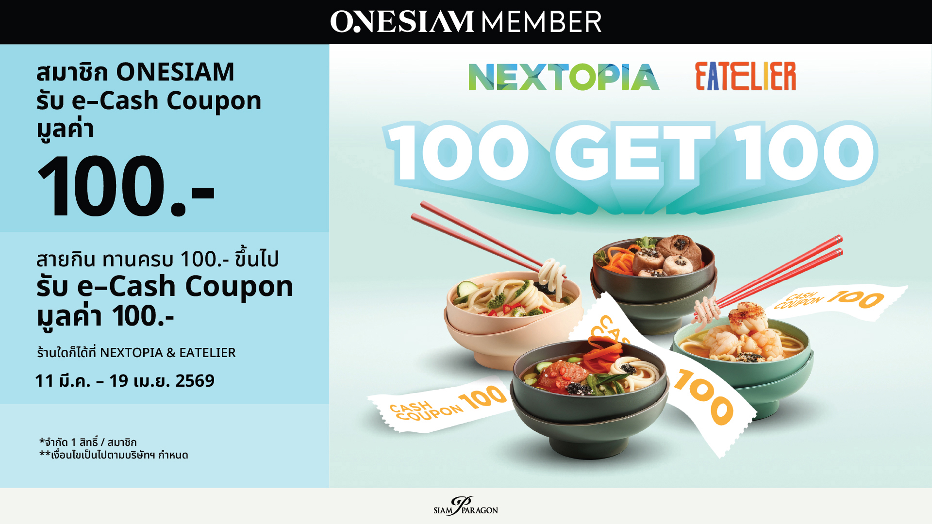 - เฉพาะสมาชิก ONESIAM กิน 100 ได้คืน 100! เมื่อรับประทานอาหารที่ NEXTOPIA หรือ EATELIER ระหว่างวันที่ 11 มีนาคม 2569 – 19 เมษายน 2569/ พร้อมลงทะเบียนและสะสมยอดใช้จ่ายขั้นต่ำแค่ 100.- รับเพิ่ม e-Cash Coupon มูลค่า 100.- สำหรับใช้ขั้นต่ำ 500 บาท ในสยามพารากอนครั้งถัดไป