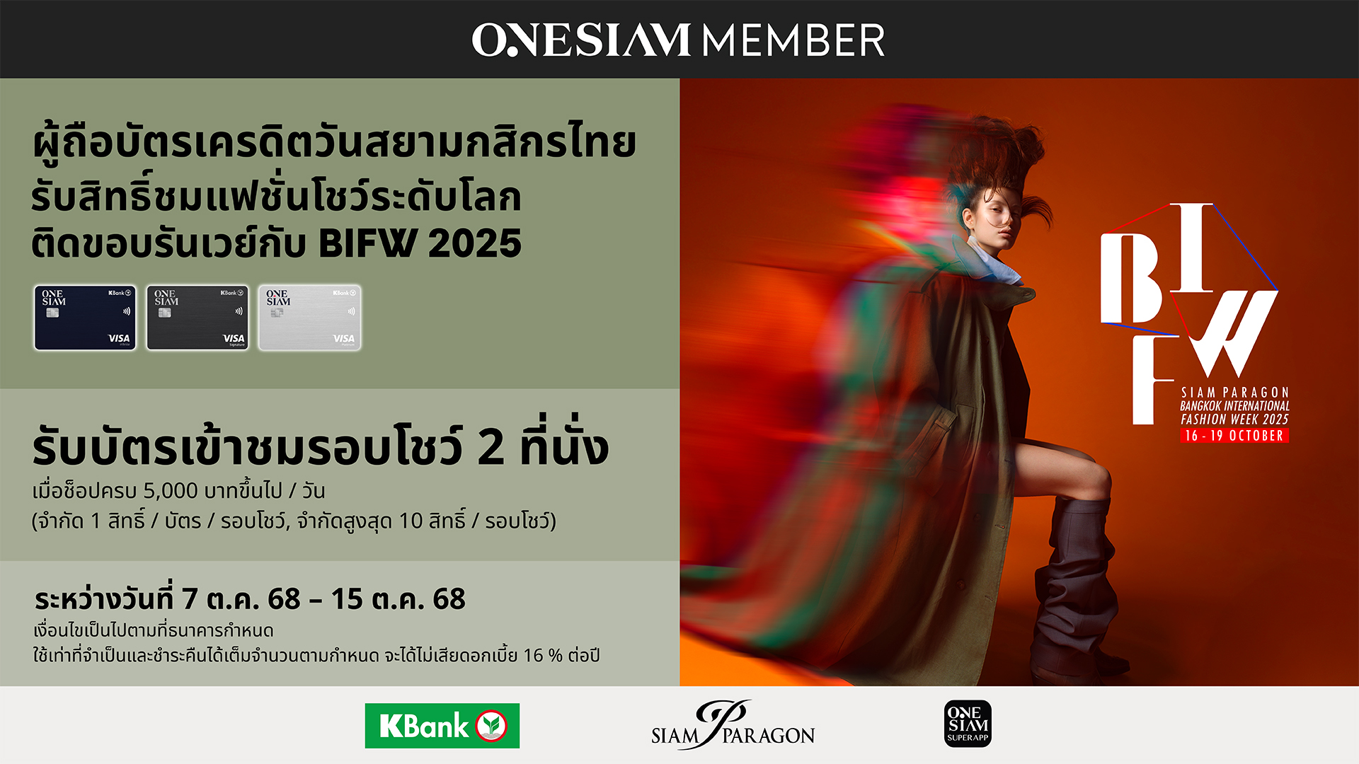 สิทธิพิเศษเฉพาะลูกค้า OneSiam KBank Credit Card มาแล้ว!! กับงาน Siam Paragon Bangkok International Fashion Week 2025 แค่ช็อปครบตามเงื่อนไข ก็ได้สิทธิ์เข้าชมแฟชั่นโชว์สุดไอคอนิก แบบฟินๆ!!