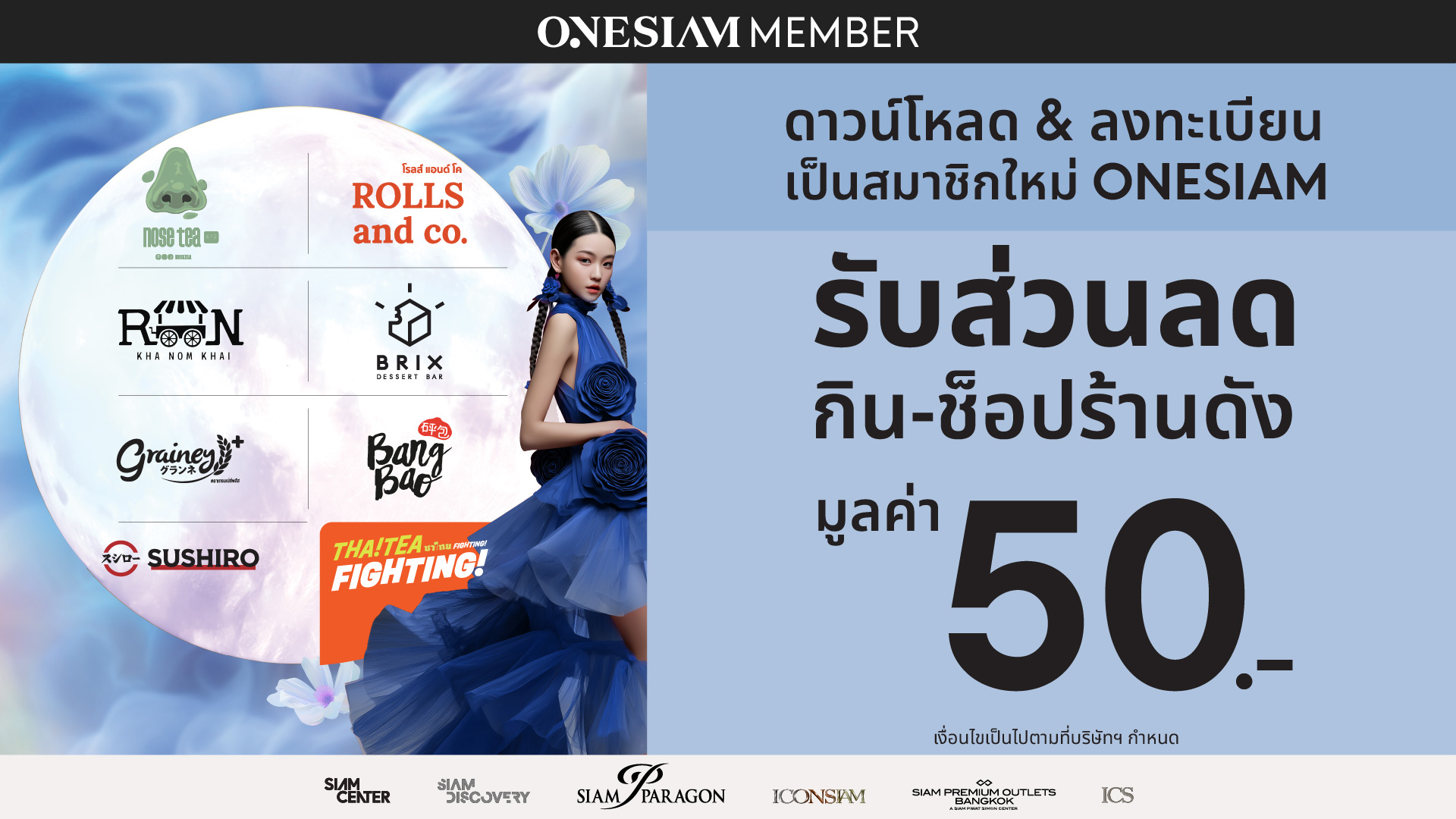 สมัครสมาชิกใหม่บน ONESIAM SuperApp รับฟรี! Cash Coupon มูลค่า 50 บาท เลือกใช้ได้กับ 1 ใน 4 ร้านสุดฮิต (1 สิทธิ์ / 1 ร้าน เท่านั้น)