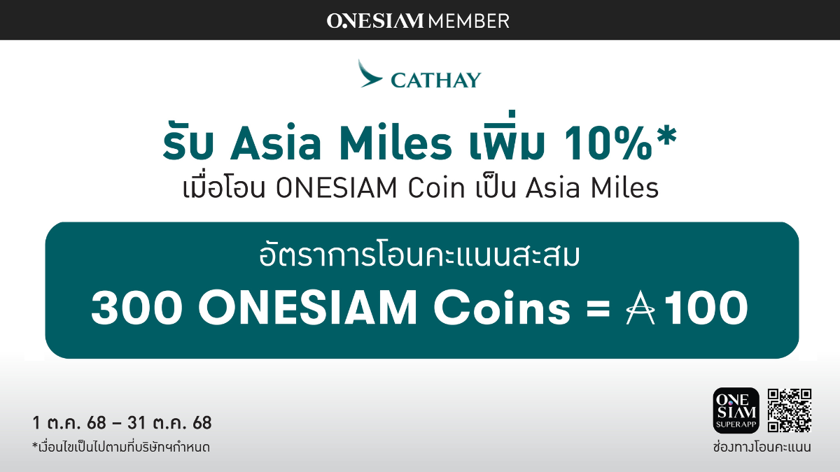 รับ Asia Miles เพิ่ม 10%* เมื่อโอน ONESIAM Coin เป็น Asia Miles ตั้งแต่ 1 ต.ค. 68 - 31 ต.ค. 68