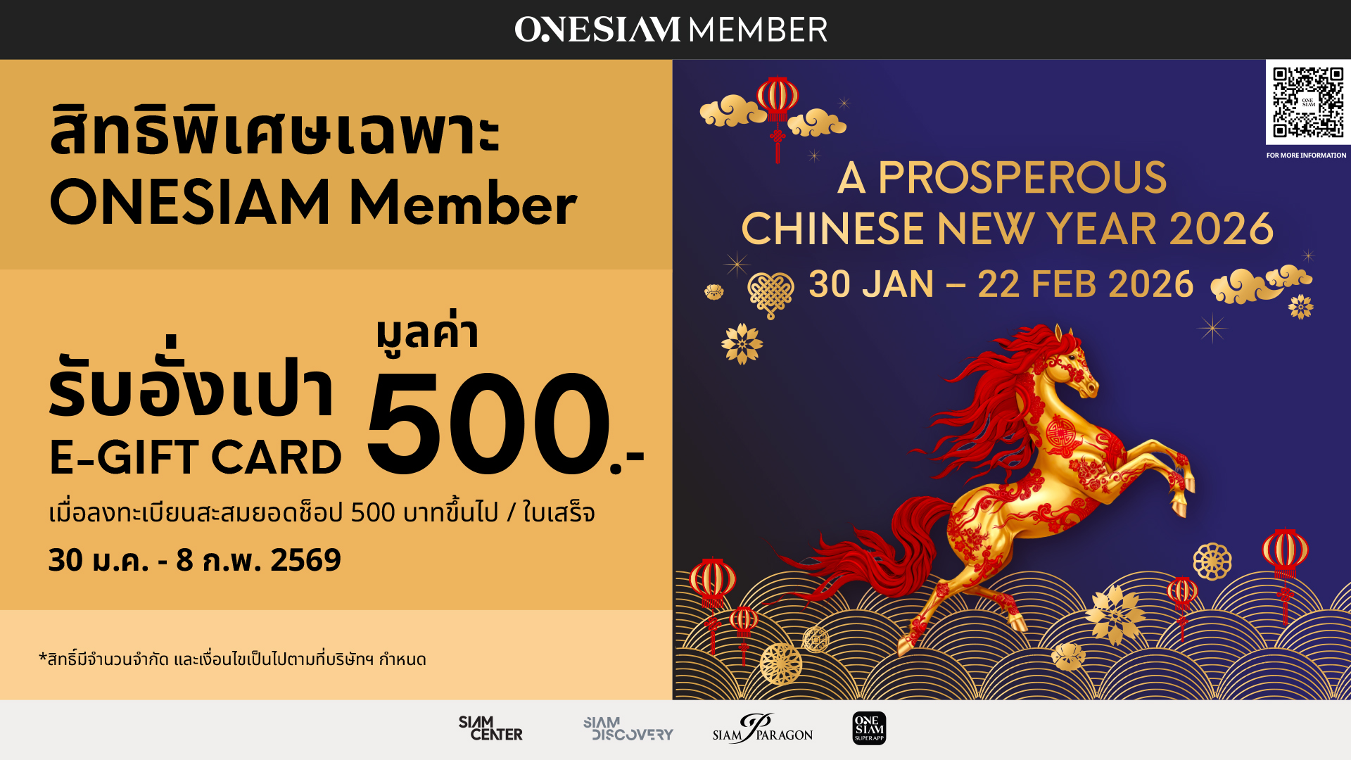 ลงทะเบียนเข้าร่วมโปรโมชั่นผ่าน ONESIAM SUPERAPP และ สะสมยอดใช้จ่าย 500 บาทขึ้นไป/ใบเสร็จ เพื่อรับ E-ANGBAO (E-GIFT CARD) มูลค่า 500 บาท(2) สำหรับช็อปสินค้าในร้านค้าที่ร่วมรับ E-GIFT CARD ตามเงื่อนไข จำกัด 2,026 สิทธิ์ตลอดรายการ (สยามพารากอน 1,013 สิทธิ์, สยามเซ็นเตอร์และสยามดิสคัฟเวอรี่ 1,013 สิทธิ์) ผู้ได้รับสิทธิ์จะได้รับ E-ANGBAO (E-GIFT CARD) ในวันที่ 11 ก.พ. 69 โดยมีอายุการใช้งานวันที่ 13 ก.พ. 69 - 17 ก.พ. 69