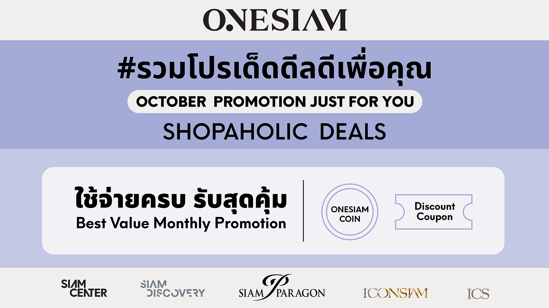 “SHOPAHOLIC DEALS” ดีลคุ้ม ประจำเดือนตุลาคม ที่สมาชิก ONESIAM ต้องปักหมุด จากทั้ง 5 ศูนย์การค้า ช็อปเลยที่ศูนย์การค้าสยามเซ็นเตอร์, สยามดิสคัฟเวอรี่, สยามพารากอน, ไอคอนสยาม, และ ไอซีเอส