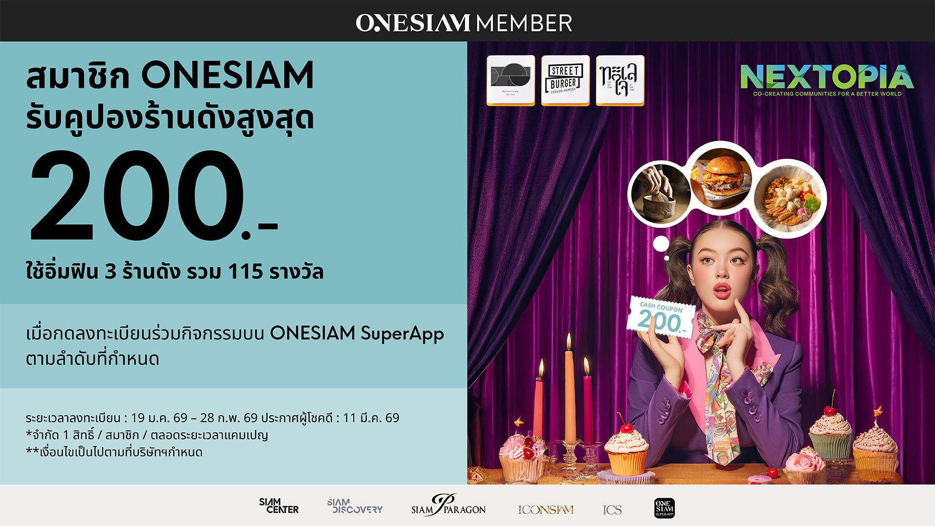 มื้อนี้อิ่มฟิน เฉพาะสมาชิก ONESIAM รับสิทธิ์ลุ้นคูปองส่วนลดสูงสุด 200.- สำหรับใช้ที่ ร้าน Shersanctuary, Street Burger หรือ ทะเลใจ