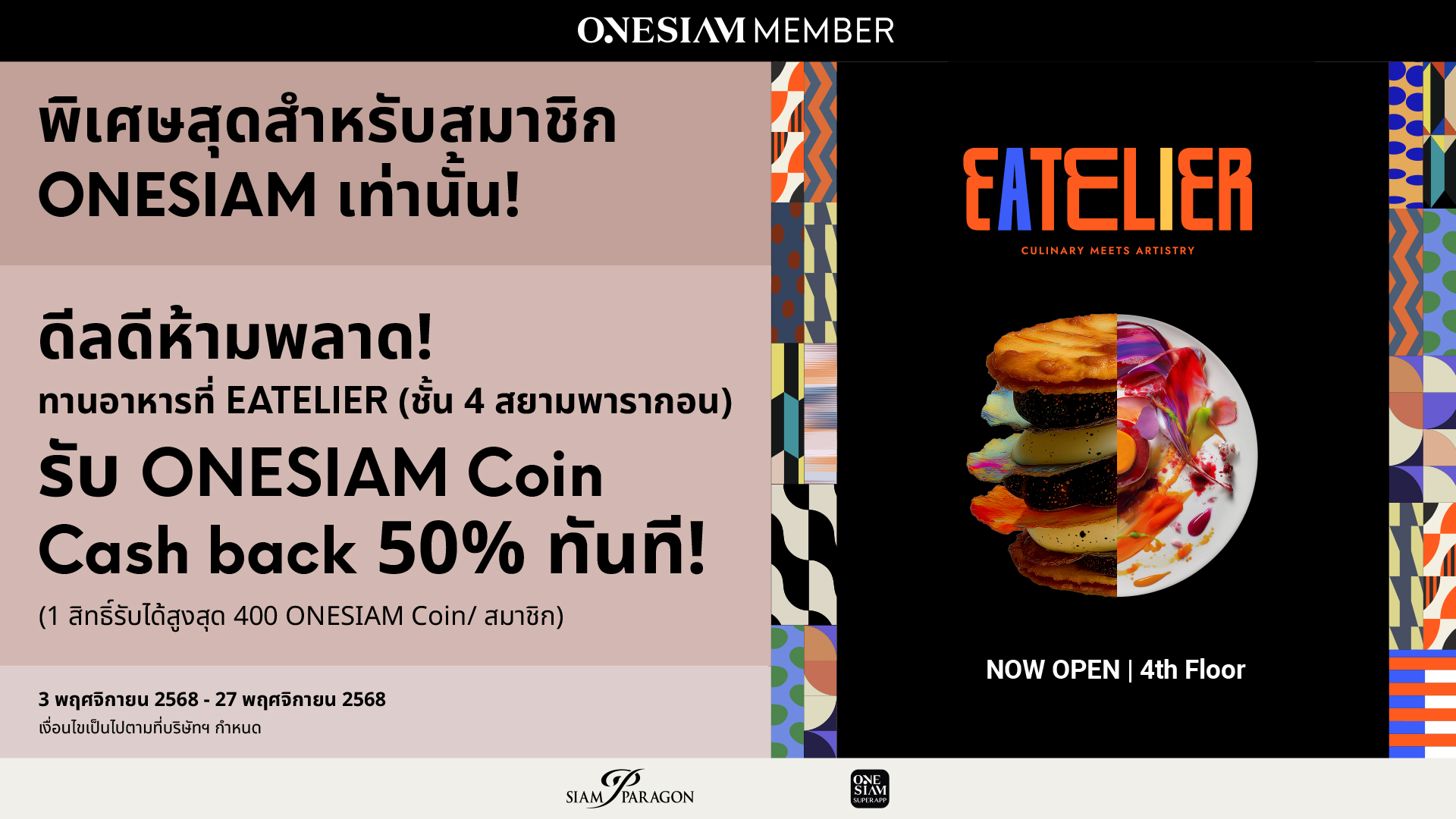 - สงวนสิทธิ์เฉพาะสมาชิก ONESIAM เมื่อรับประทานอาหารที่ EATELIER (ชั้น 4และ 5) ที่ศูนย์การค้าสยามพารากอน (ไม่รวมยอดใช้จ่ายผ่านออนไลน์) ระหว่างวันที่ 3 พฤศจิกายน 2568 – 27 พฤศจิกายน 2568 เฉพาะร้านค้าที่ร่วมรายการระหว่างวันจันทร์-พฤหัสบดีโดยสมาชิกต้องต้องถ่ายรูปใบเสร็จผ่าน ONESIAM SuperApp ด้วยตนเอง (Snap & Collect ลงทะเบียนก่อนรับสิทธิ์) รับ ONESIAM COIN 50% (1 สิทธิ์ รับได้สูงสุด 400 ONESIAM COINS/สมาชิก)
