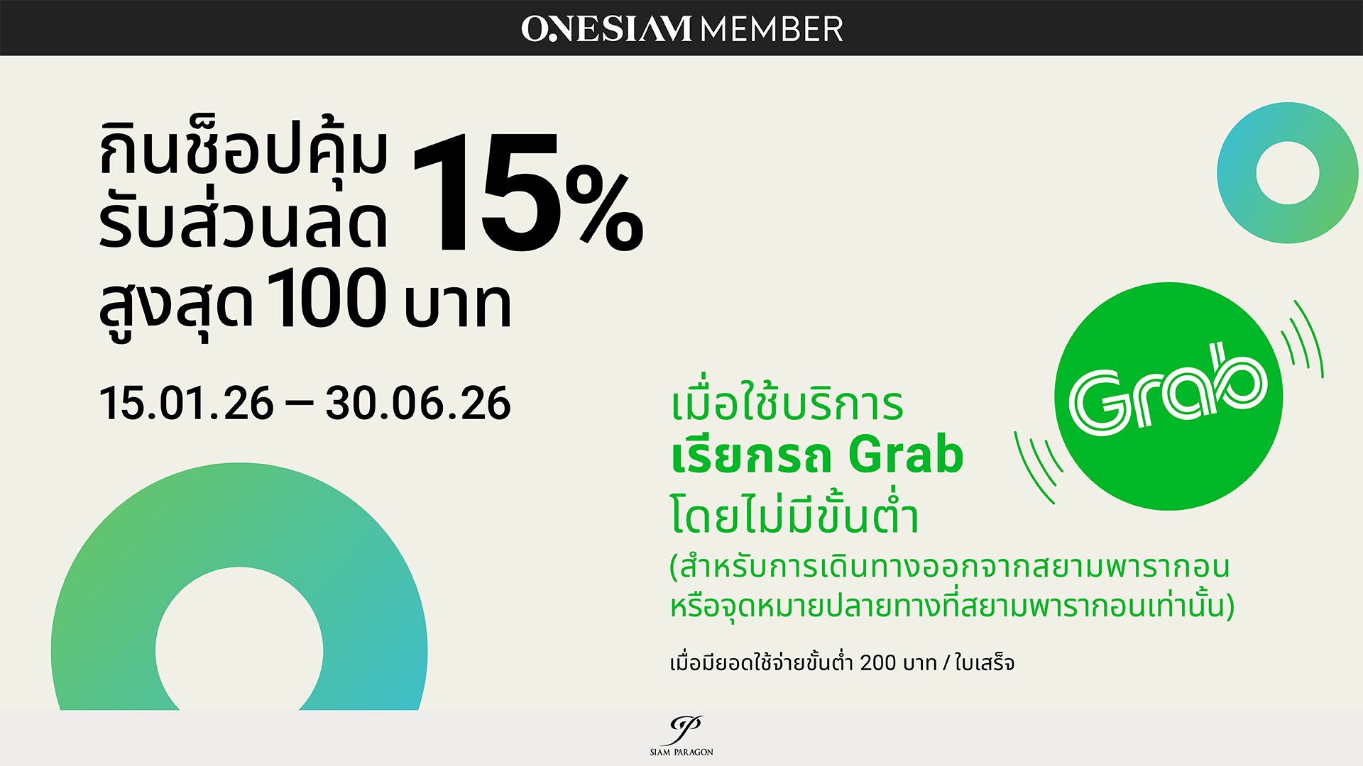 รับส่วนลด 15% สูงสุด 100 บาท เมื่อใช้บริการผ่าน Grab Transport โดยไม่มีขั้นต่ำ (สำหรับการเดินทางออกจากสยามพารากอน หรือจุดหมายปลายทางที่สยามพารากอนเท่านั้น) เมื่อมียอดใช้จ่ายขั้นต่ำ 200 บาทขึ้นไปต่อใบเสร็จ ณ ร้านค้าที่สยามพารากอน