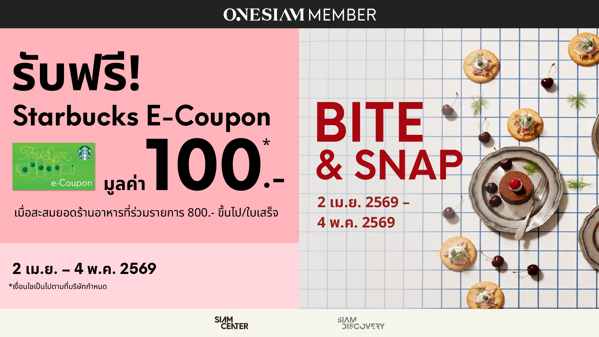 - เฉพาะสมาชิก ONESIAM เมื่อมียอดใช้จ่ายร้านค้าหมวดอาหารและเครื่องดื่ม ตั้งแต่ 800 บาทขึ้นไป/ใบเสร็จ ที่ สยามเซ็นเตอร์ และ สยามดิสคัฟเวอรี่ ตั้งแต่วันที่ 2 เมษายน 2569- 4 พฤษภาคม 2569 ทั้งนี้ไม่รวมยอดใช้จ่ายผ่านออนไลน์ ลงทะเบียนก่อนรับสิทธิ์ ช่องทางสะสม SNAP & COLLECT, INFORMATION COUNTER, สะสมที่ร้าน