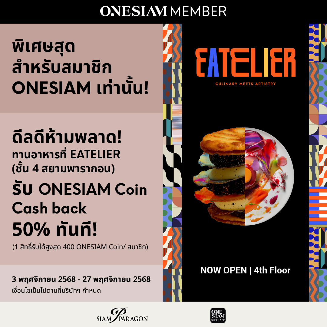 รับประทานอาหารที่ EATELIER (ชั้น 4และ 5) เฉพาะร้านค้าที่ร่วมรายการ ในวันจันทร์-พฤหัสบดี แลกรับ ONESIAM COIN 50% (1 สิทธิ์ รับได้สูงสุด 400 ONESIAM COINS/สมาชิก) จำกัด 1 สิทธิ์/สมาชิก, จำกัด 200 สิทธิ์/สัปดาห์